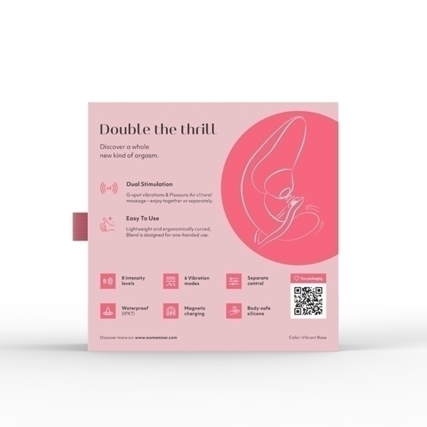 吸引と振動をダブルで楽しめるウーマナイザー!吸引強弱は8段階、振動パターンは6種類搭載。完全防水なのでバスルームでも使用可能。使用後は丸洗いでき、衛生的に使用できます。独立した2つのモーターにより、吸引と振動を同時に、または別々で楽しむことができます。吸引と振動、ダブルの刺激によるオーガズムを「ブレンドオーガズム」と言いますが、このウーマナイザーブレンドはまさにブレンドオーガズム初心者の方にぴったりなアイテムです!●カラー:ヴァイブラントローズ※こちらの商品は受注発注商品の為、ご注文から発送までに3、4営業日掛かる場合が御座います。