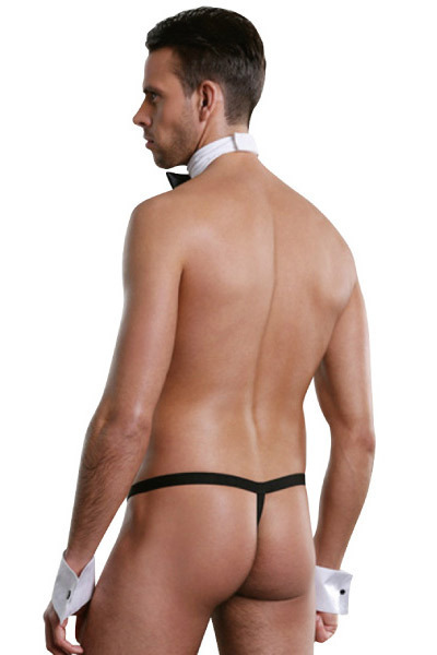 ランジェリーでもフォーマル気分!オシャレ度がグンとUPするメンズ用下着セット。●黒×白のシックなバイカラー仕様●タキシードデザインのGストリング●蝶ネクタイが可愛いアクセントに●付け襟・付けカフスもセット。おもてなしやエスコートはおまかせあれ!インナーなのにフォーマルな雰囲気が演出できる男性用ランジェリー。特別な夜や記念日などにぜひどうぞ。