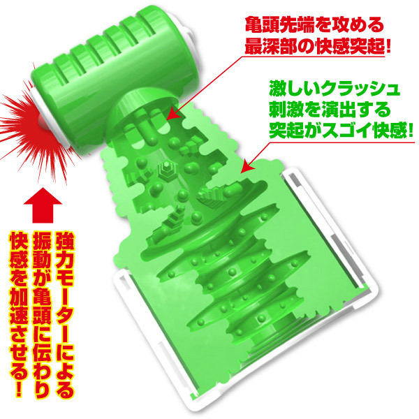 ピラミッド突起の激しい刺激でカリクラッシュ!カラフルポップな亀頭用の電動オナニーグッズ。●グリーンカラーのTYPE02「クラッシュ」●ソフトシリコンの入口が優しくホールド●高刺激のピラミッド型突起●尿道責め突起を最奥に配置●先端に強力モーター搭載●振動パターンは12種類。抜群のフィット感を生み出すヒダ形状の挿入口でしっかりキャッチ!多種多様なイボと振動で亀頭を集中攻撃してくれるスタイリッシュな電動オナカップです。
