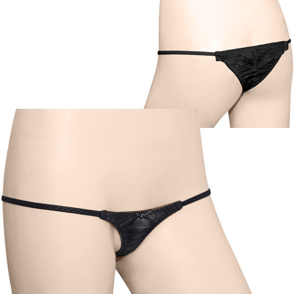 ワレメにグッと食い込むラインが超セクシー!露出度MAXのマイクロショーツ(日本製)。●大人セクシーなブラックカラー●クシュクシュ感が可愛いギャザー入り●フロント:ミニリボン付き●お尻が丸見えなTバック仕様●Mサイズ。バックに施されたフラワー刺繍が上品な大人ショーツです。
