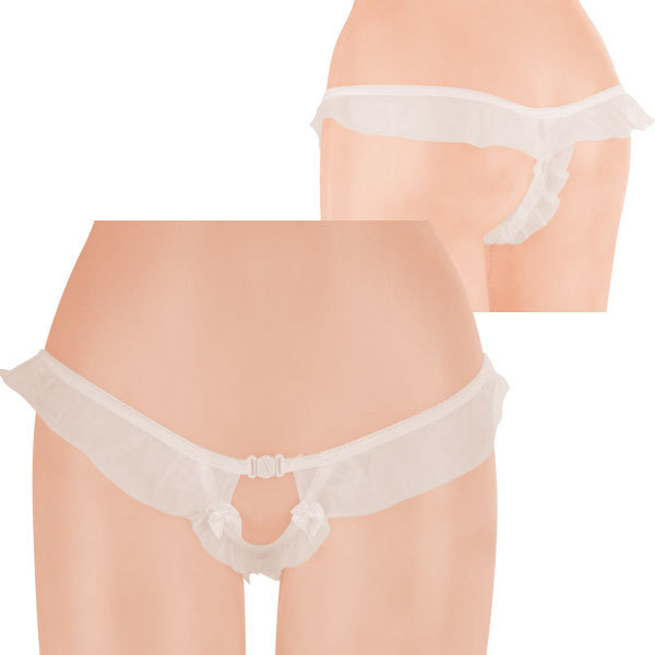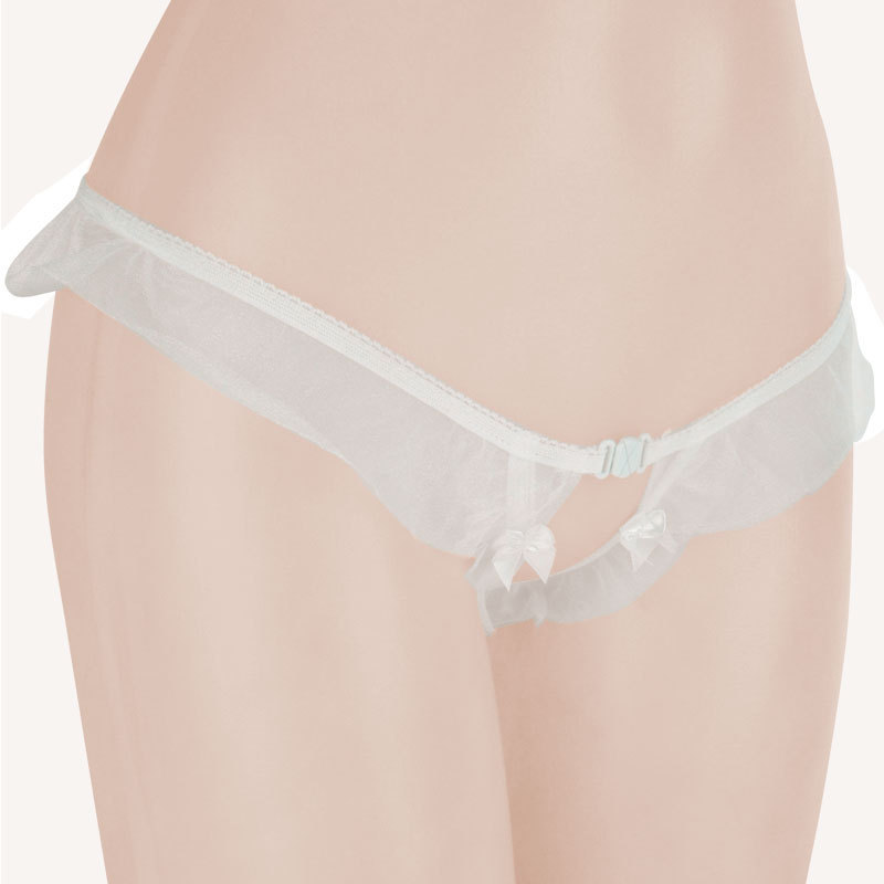 たっぷりフリルが可愛い!大人なギミックが隠されたセクシーショーツ。●天使の羽のような柔らかホワイト●ウエスト周りに幅広フリルをプラス●リボン付きフロントはオープン仕様●フリルによるTバックデザイン●クロッチに大粒パール内蔵済み。ただのオープンショーツと思ったら大間違い!見た目だけでなく着心地までセクシーな大人ランジェリー。リボン+フリル+パールのロマンチックなデザインです。