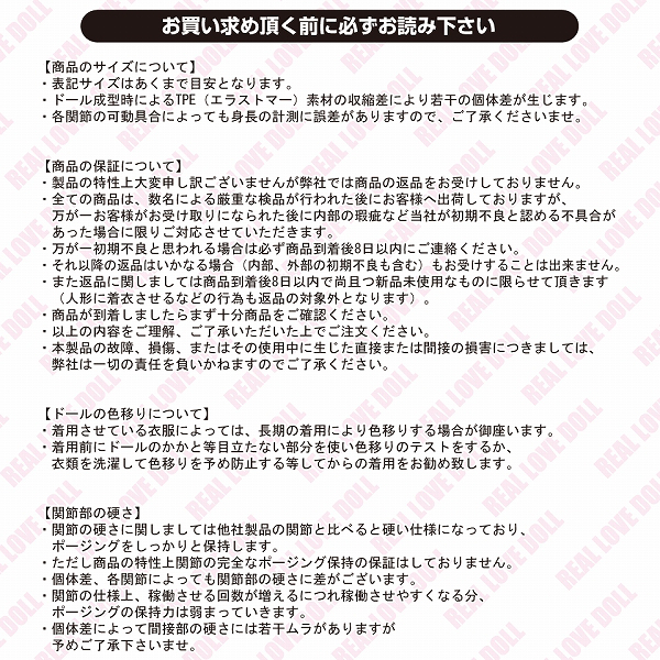 手、足、腰が自在に可動!柔らかな人肌ボディを再現した等身大サイズのリアルラブドール。●清楚な女子大生の美琴●最適限のメイク済みフェイス●ブラウンカラーのロングカールヘア●リアルな人肌感のグラマラスボディ●身長153cm・体重約32kg●B78cm・W56cm・H82cm●一般的な衣類のMサイズを着用可●各関節可動で様々な体位を実現●口はオーラルプレイにも対応●ヴァギナ:付属オナホール内蔵●アナルはドールに直接加工したヒダ構造●視線、首の角度調整も自在。ハイクオリティな究極の嫁を造形した高級リアルドール!オナホールだけでなく、お手入れ用品まで付属した超豪華なフルセット仕様です。※大型商品の為、送料が別途必要になります。