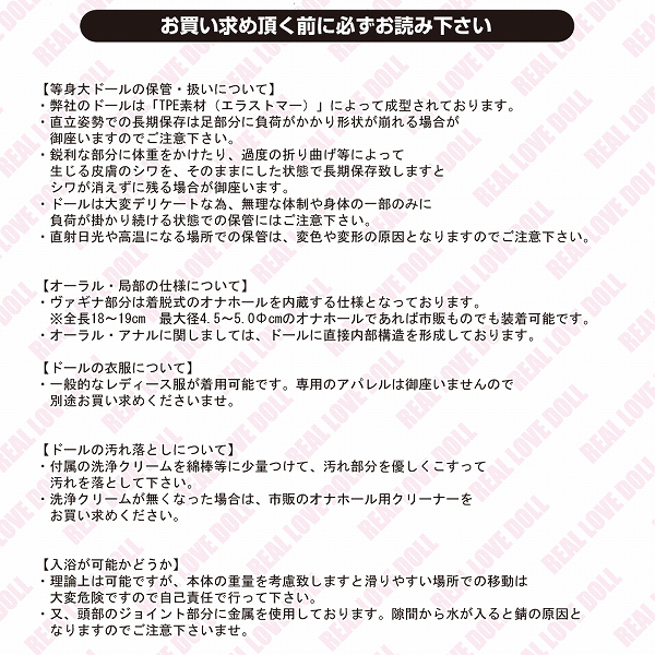 まるでグラビアアイドル♪完璧スタイルで魅了する超リアルラブドール。●高身長な165cmのほっそりボディ●モッチリ柔らか弾力エラストマー●Mサイズの服・衣装を着せられる●目線・首・関節は自由自在に可動●あらゆる体位・ポージングも簡単●ほんのりメイク済みの美しい表情●柔らかな唇でフェラチオプレイも●ヴァギナ…着脱可能な付属オナホ●アナル…ドール内部のリアルヒダ●バスト…憧れのパイズリプレイOK●その他グッズ付属の充実セット。スラリとした手足、締まったウエスト、柔らかく大きな胸…同性が羨むほどのナイスバディを持つリアルドール。しっかりしたサイズ感としなやかな弾力感で、本物に引けを取らないラブプレイを楽しめます。※大型商品の為、送料が別途必要になります。