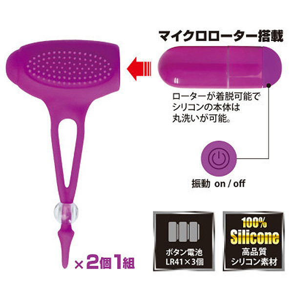 キュッと絞って乳首に装着♪悶絶刺激のシリコン製ニップルローター。●両乳首用本体2個セット●高品質シリコンを使用●側面に突起ブラシ付き●穴に乳首を通して装着●クリアビーズで調整可●乳首&乳房に振動刺激●シリコン部は丸洗いOK●ローターは着脱可能。乳首直下にブルブル振動+突起ブラシの悶絶刺激!「プリティラブ」シリーズの高品質シリコン製おっぱいローター。付属のマイクロローター(電池交換可)を取り外せば、本体は丸洗いできるのでとっても衛生的!単体で使えば乳首責めだけでなく、クリトリス責めにも役立ちそうです。