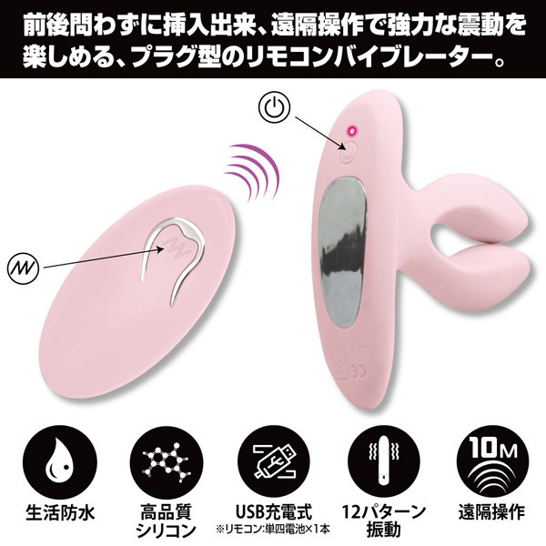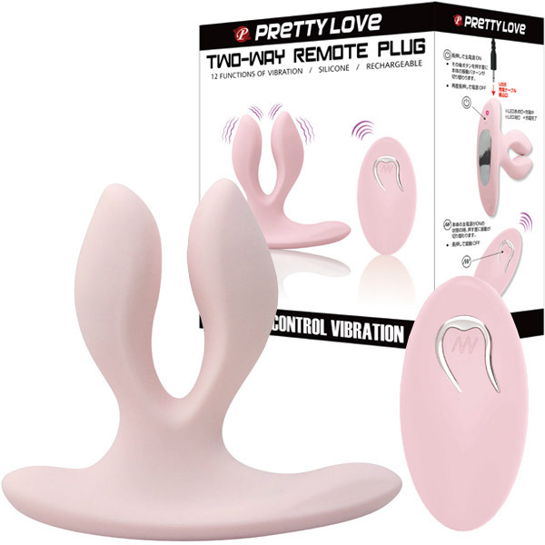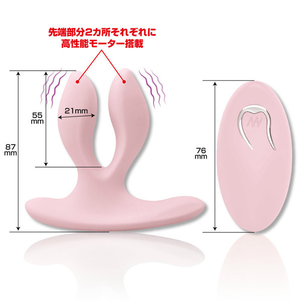 前後問わずに挿入可能!ユニークな二股プラグデザインのリモコンローター「プリティラブ ツーウェイリモートプラグ」。アーム両先端に強力モーターを搭載した二股デザインの高品質シリコン製ローター。12パターンの振動機能を備えた両ヘッドは自在に曲がるフレキシブル仕様!片側のアームのみ挿入すればGスポ+クリトリスの同時刺激も可能に!さらには「押し当て」や「挟み込み」によるピンポイント刺激まで楽しみ方のバリエーションも豊富です。最大10mの距離から遠隔操作できるワイヤレス仕様で屋外プレイも楽しめる『プリティラブ』シリーズのリモコンローター。生活防水仕様のローター本体はUSB充電式、リモコンは単四電池×1本(別売り)を使用します。