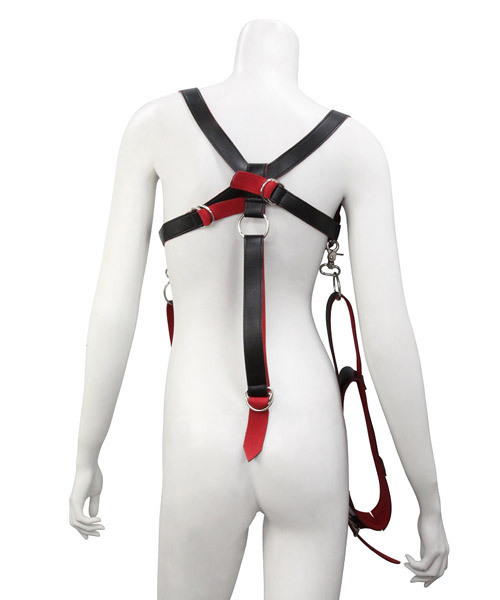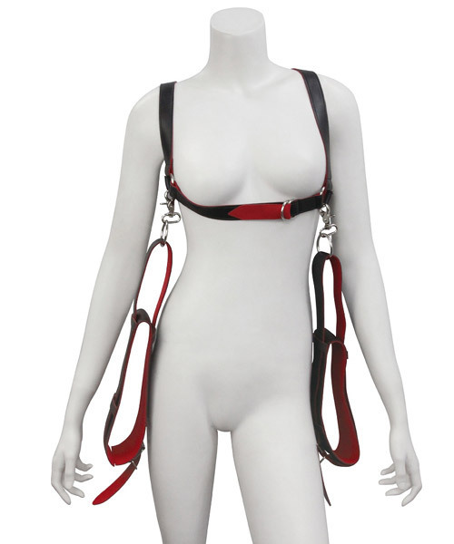 SMプレイの深淵へと導く!赤と黒のフェイクレザーが妖艶な『ABYSS』シリーズのSMグッズ「Abyss(アビス) 太腿固定M字開脚ベルト」。M字開脚を強制させて羞恥心を煽るSM用緊縛ベルト!背面のベルトで両腕を吊り下げられますが腕を完全に拘束するものではございませんので、手枷を別途ご用意頂くとより拘束感が高まります。材質はフェイクレザー・鉄。※モデル着用のニップルタッセル、ショーツ、ストッキング等は付属しておりません。