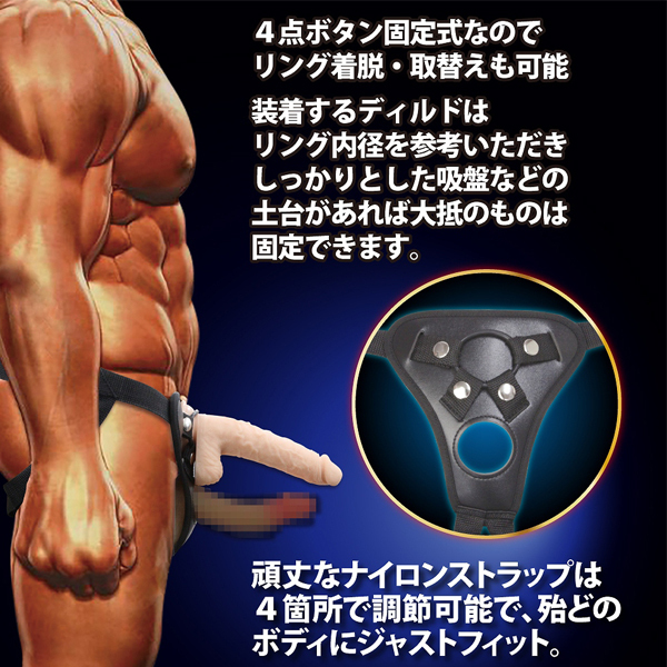 一人でも二人でも楽しめる!お気に入りのディルドを固定&装着できるハーネスが登場。4つのボタンで吸盤ディルドをしっかり固定!玉袋付のものなら2箇所固定でより安定させられる♪夫婦やカップルで使用の際は、内径4.5cmの空いた穴から男性器を通せば2穴責めも可能です◎大中小の3サイズの付け替え用リング付属