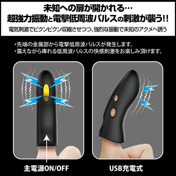 振動×低周波パルスのコンボ技!指に装着するだけで簡単に使えるUSB充電式エレクトリックグッズ。先端の金属部分から発する脈打つような低周波パルスがピンポイントに電撃!7段階の強力振動と組み合わさりまだ見ぬアクメ体験へと誘う♪素材は柔らかな医療用シリコン採用!※他者に使用する場合、金属部分のほか肌が触れ合っていないと通電しませんのでご注意下さい。