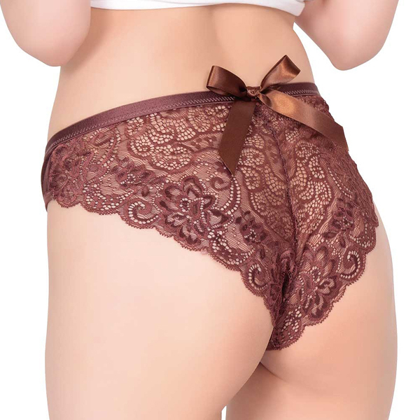 ペイズリーやフローラルをあしらったレースと大きめリボンのバックスタイルが超カワイイ!女性が喜ぶチョコレートの香りを付けた魅惑のランジェリー。バックの優雅なシースルーレースとサテンリボンでヒップを強調。バレタインにもピッタリなチョコレート香るパンティ。