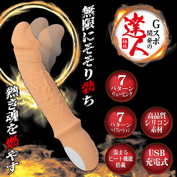 リアルタイプのディルドに特殊なアクションとバイブ機能とを搭載したトレートタイプのバイブレーター「Gスポ開発の達人」。亀頭部分の上下するウェービングアクションがGスポを的確に刺激!ノッキングするように刺激しながらGスポイキを誘発してくれます♪大きさ的にもミドルサイズでちょうどよく、色味やフォルムなどの見た目がリアルディルドっぽいので亀頭や余り皮、血管といったギミックとも相まって、視覚的にも興奮を掻き立ててくれます。無限にそそり勃つような上下の7パターンの動きが心地よく、Gスポを狙えばノッキングするような刺激が、同時に7パターンのバイブ機能がお楽しみいただけます♪電源はUSB充電式電池切れの心配も不要!高品質シリコン素材で先端付近にはヒート機能も搭載されているので人肌な温もりとリアルな挿入感がお楽しみいただけます。