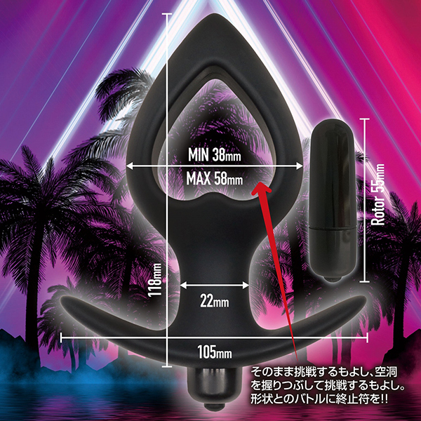 上質なシリコンを潤沢に使い100%シリコン製で仕上げた電動ディルド。ハート型のようなスペード型のようなフォルムで、中央部が大きく空洞になっています。前でも後ろでも使用可能。押しつぶすように挿入すると内部で復元され内側からの強烈な圧迫と振動で驚きの天国体験を味わえます。※ローターはシングルスピードとなります※付属の電池はテスト用電池となります。
