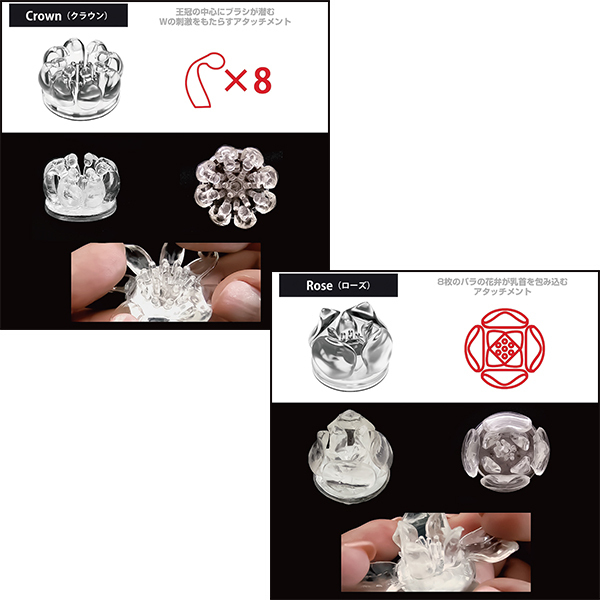 個性あふれる5種のアタッチメントを、両乳首に使えるよう、すべて2個ずつご用意。セットで使うもよし、あえて別々にして2人から乳首責めを疑似体験するのも一興です。●Crown(クラウン)王冠の中心にブラシが潜む、ダブル刺激のアタッチメント●Rose(ローズ)バラの8枚の花弁を模したアタッチメント。●Crab Claw(クラブクロウ)カニ爪のようなユニーク形状が、がっちり乳首を挟み込むアタッチメント。●Triple Tongues(トリプルタン)3つのねじれた舌が交差するアタッチメント。●Prickle Cup(プリクルカップ)●素材:エラストマー※直にお肌と接触する場合は、必ずローション(水溶性)をご利用ください。※こちらの商品はニップルドーム・カップシリーズの交換用アタッチメントです、商品単体ではご使用いただけませんのでご注意ください。