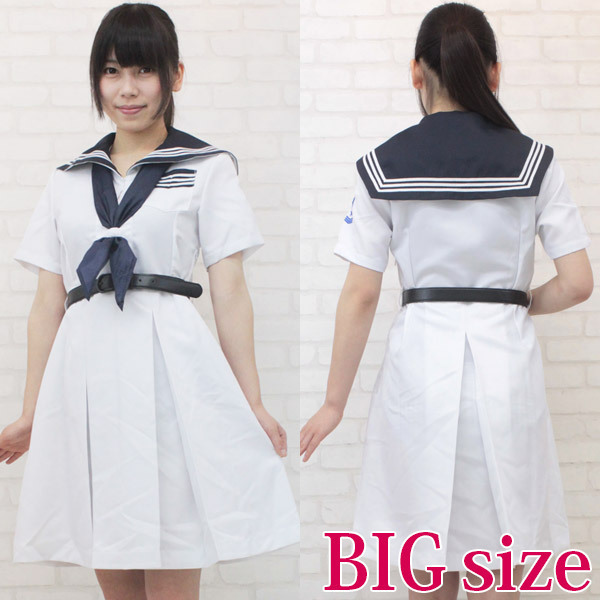 真っ白な半袖ワンピースで爽やかに!誰もが憧れるお嬢様学校風のセーラー服コスチューム(BIG)。ちょっぴり長め丈の夏服ワンピが清楚な印象!ベルトがポイントになるので脚長効果も抜群!もちろん紺色のスカーフもセットです。※水洗い不可、塩素系漂白剤による漂白不可、アイロンは中温で当て布使用、ドライクリーニング可、色落ちの可能性があります。※こちらの商品は在庫の状況によりお届けまでに4日〜7日程度かかる場合がございます。