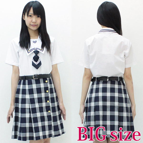 チェック柄のボックスプリーツスカートについた金ボタンがとってもオシャレな夏服仕様の制服コスチューム(ベルト付き)です。2本のラインが入った襟・ネクタイが特徴的なブラウスがキュートさをさらにアップ!BIGサイズなのでぽっちゃり体型の方でも安心して着られます。※水洗い不可、塩素系漂白剤による漂白不可、アイロンは中温で当て布使用、ドライクリーニング可、色落ちの可能性があります、ご注意ください。※こちらの商品は在庫の状況によりお届けまでに4日〜7日程度かかる場合がございます。