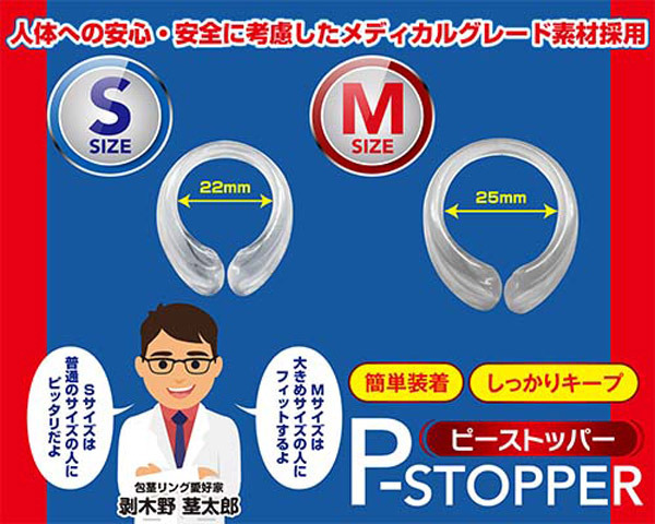戻りそうな皮にもムキ癖を!それがこちらのピーストッパーです。装着が簡単でバレずにラクラク矯正!装着していることがバレにくいので、皮を剥くための足がかりとして最適な逸品。Sサイズは普通サイズの人にピッタリ!自然なフィット感だから長時間キープでも問題なし。●内径2.2cmのクリア矯正リング。●普通サイズの方に最適なSサイズ。●皮を剥いて付けるだけの簡単装着。●ズレにくい厚め仕上げでフィット。●メディカルグレード素材で安心・安全。厚めリングでしっかり矯正!悩める包茎さんの為の矯正ストッパー。簡単装着&自然なフィット感で剥けた状態を長時間キープします。