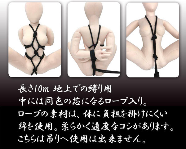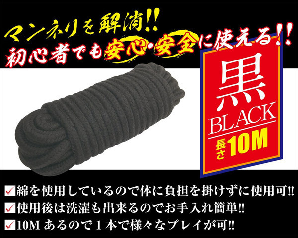 初心者でも簡単♪ソフトSMにぴったりな綿素材を使用した緊縛ロープ「簡単拘束ロープ 黒」。●身体に負担をかけない綿素材●柔らかく適度にコシのある仕上がり●様々なプレイを実現する長さ10m●使用後は洗濯も出来て衛生的●緊縛師「青山夏樹」推薦。緊縛プレイでマンネリ解消!緊縛事故防止の教育・啓発を行うNPO法人BDSMセーフティーサポート協会代表の女緊縛師「青山夏樹」推薦!安心・安全に使用できるSMグッズです。※本商品は吊りへの使用は出来ません。
