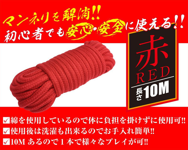 初心者でも簡単♪ソフトSMにぴったりな綿素材を使用した緊縛ロープ「簡単拘束ロープ 赤」。●身体に負担をかけない綿素材●柔らかく適度にコシのある仕上がり●様々なプレイを実現する長さ10m●使用後は洗濯も出来て衛生的●緊縛師「青山夏樹」推薦。緊縛プレイでマンネリ解消!緊縛事故防止の教育・啓発を行うNPO法人BDSMセーフティーサポート協会代表の女緊縛師「青山夏樹」推薦!安心・安全に使用できるSMグッズです。※本商品は吊りへの使用は出来ません。