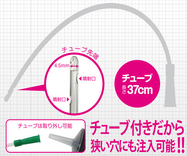 ペットボトル一本分!?大容量500mlのプラスチック製シリンジ。本格的なお医者さんごっこが自宅で手軽に遊べることで人気の「MEDY」シリーズから、お尻洗浄に便利な洗浄用の注射筒が登場!最大幅4.5mm、狭い穴の奥まで行き届く長さ37cmの噴射口を設置したチューブも付属で、取り外し可能なので使用後は綺麗に洗って保管することも◎小口径延長キャップも付いています。