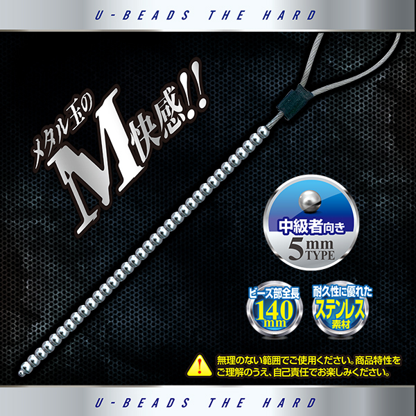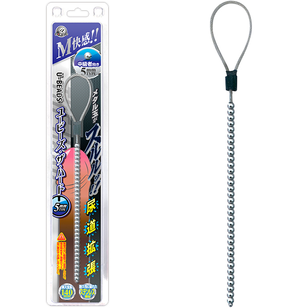 U−プラグシリーズに、ビーズな奴らが登場。メタル玉のM快感をアナタに。中級者向けのハードな5mm玉。ステンレス製だから煮沸消毒もでき、冷水や温水で冷やしたり温めたり、好みに合わせて楽しめます。ワイヤー連結で耐久性もバツグン。使用後の汚れも流しやすい。<ご注意>無理のない範囲でご使用ください。商品特性をご理解のうえ、自己責任でお楽しみください。
