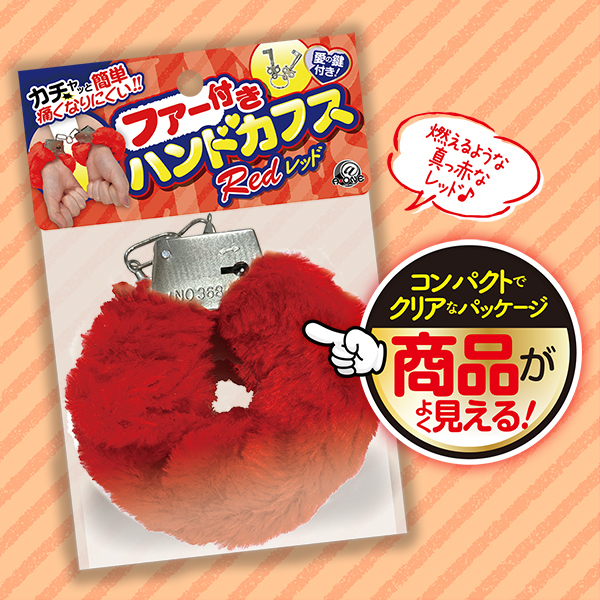オシャレにソフトSMしてみない?かわいいファー付きの手枷が、定番の4カラーで同時発売!もちろん、プレイが盛り上がる鍵も付属♪ァー付きだから、長時間でも痛くなりにくい!!カチカチッとスライドさせれば簡単に拘束調整ができ、鍵を万が一なくしても解除できる安全レバー付き!プレイだけでなく、普段のちょっとしたファッションにプラスしてもカワイイ♪情熱的なレッドでプレイする?