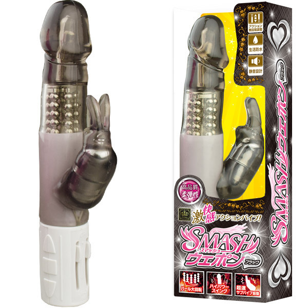 全てが上位品質!初心者も上級者も楽しめる究極のスタンダードバイブ「スマッシュウェポン ブラック」。触り心地&挿れ心地抜群なお肌に優しい高品質素材の二股ボディ。内部をグリグリ刺激するハイパワースイングとパール大回転に加え、ウサ耳型の超速クリバイブ振動も搭載した激快感アクションバイブ。ハイパワーなアクションを簡単に微調整できる無段階スライドスイッチを採用!もちろん生活防水&静音設計でメンテナンス性も抜群です。