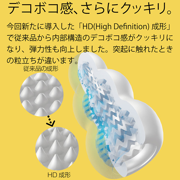 全てが新しくなったプッチ。ポケットサイズのローション不要ホールプッチシリーズが生まれ変わって新登場。軟性素材から内部の構造、パッケージ、全てが新しくなりました。デコボコ感、さらにクッキリ。今回新たに導入した「HD(High Definition)成形」で突起のデコボコ感がさらにクッキリになりました。突起に触れたときの粒立ちが違います。弾力感、さらにモッチリ。「HD 成形」により軟性樹脂の弾力性も向上。さらにモッチモチに、しなやかな素材になりました。内部構造も、さらにハッキリ。オリジナルシリーズ、スイーツシリーズ計8種類の内部構造をより精密な造形にリニューアル。「HD 成形」とあいまってデコボコ感がよりハッキリわかる構造になりました。生産工場を一新。新型プッチシリーズは日本国内に新設した工場から生産。最新の設備と厳密な品質管理で一つ一つ丁寧に作ります。ローション不要、必要なのは水だけ。ローション不要軟性素材「プラスウェッチ」水分が付着すると潤い成分が反応、ねっとりした潤いに包まれます。<カカオ内部構造>「反り返りのあるヒダの多層構造」ビッシリ並んだヒダは反発しながら複雑に絡みつく刺激