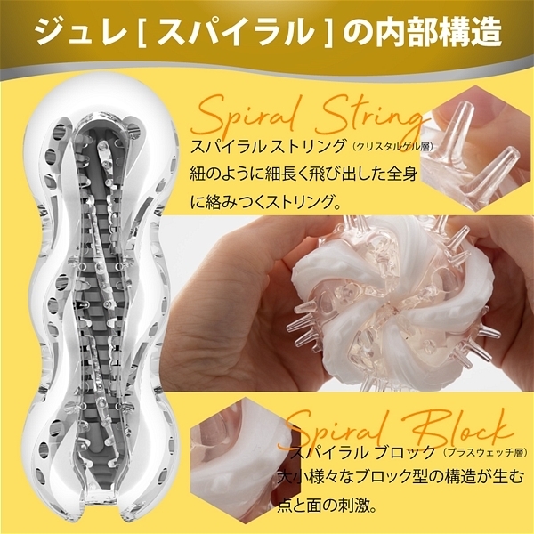 【ジュレスパイラルの内部構造】スパイラルストリング(クリスタルゲル層)紐のように細長く飛び出した全身に絡みつくストリング。スパイラルブロック(プラスウェッチ層)大小様々なブロック型の構造が生む点と面の刺激。【メンズマックスジュレとは】技術の粋を集め開発した「ハイブリット2層構造」で作られた繰り返し使用可能なホール。【デザイン】透明な雫の中に浮かべた純白のオブジェ。機能を追求し行き着いた2層の形状。【ギミック】水だけでねっとり潤うローション不要素材「プラスウェッチ」を採用。水に触れた瞬間から潤いはじめるジュレをお楽しみください。【新開発のハイブリッド2層構造】内側と外側が分かれた単純な2層構造ではなく2層のどちらも軟性樹脂が露出する。それぞれの性能がとろけるように絡みあい楽しめるハイブリッド2層構造を新開発。【プラスウェッチ層】水だけでねっとり潤うローション不要素材。温水を使用すればホットプレイも簡単。【クリスタルゲル層】外側を覆いながら内側まで露出するどこまでも透き通るクリスタルゲル層。【乾燥スタンド】ジュレの容器は水切りしやすい構造になっており、そのまま乾燥スタンドとしてお使い頂けます。洗い終わったジュレをタオルなどでよく拭き、乾燥スタンドに設置してください。【繰り返し使用可能】使用後は水・またはぬるま湯で洗い流してください。洗い終わったあとは付属の乾燥スタンドに設置し、直射日光や高温を避け、風通しの良い場所に保管してください。