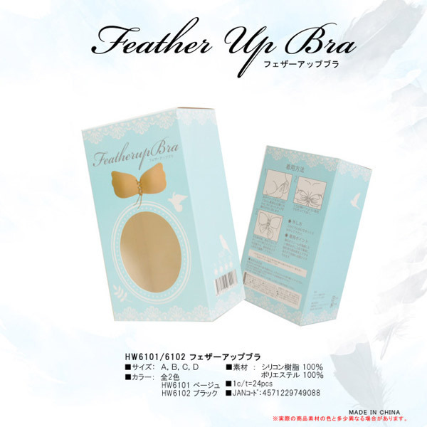 寄せて上げて谷間もメイク♪天使の羽型シリコンブラ「フェザーアップブラ ブラックB」。羽のようなカップがボディに馴染みやすいブラックカラーのモールドブラ!カップ内側は粘着シリコン樹脂、外側はサラリとした肌触りのポリエステル素材です。中央はアジャスターで自在に調整できる編み上げ仕様!胸のボリュームを強調したい場合は少し上目で着用し、紐を持って留め具を上下させるだけで自由に谷間をメイク出来ます。【着用方法】両手でカップを外に向けて反らし、最適な位置にあわせてから外に反ったカップを胸の方向に戻して、ふちが胸につくように指先でなぞって下さい。左右着用後、両手でカップをしっかり押さえて定着させ、留め具をスライドしてお好みで調整して下さい。粘着効果が薄れた際は、一度水洗いし乾燥させてから再度着用して下さい。※サイズは画像を参考にお選びください※通常よりワンサイズ小さめが綺麗に着用できる目安です※Aサイズ(h00036)もございます
