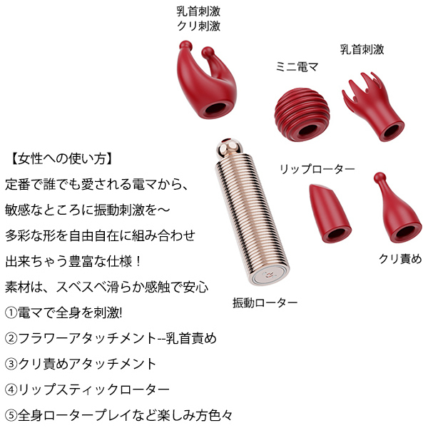 【男女兼用バイブセット】小さいのにパワフル!10種類振動×5つの付属アタッチメントを全身くまなく責めまくる!想像を超える組み合わせは一人でもパートナーと一緒でも使えてコスパ最高。初心者から上級者、ノーマルからSMまで幅広いニーズに対応アイテム。一つだけじゃ足りないかも?二色揃って使うのもオススメ。【女性への使い方】定番で誰でも愛される電マから敏感なところに振動刺激を〜多彩な形を自由自在に組み合わせ出来ちゃう豊富な仕様!素材はスベスベ滑らか感触で安心。@電マで全身を刺激!Aフラワーアタッチメント−乳首責めBクリ責めアタッチメントCリップスティックローターD全身ロータープレイなど楽しみ方色々。【男性への使い方】@フラワーアタッチメントで亀〇責め!全面的にガバッと被せて密着させ、あらゆる方向から8個の振動ポイント、口内圧迫感ような刺激との相性も抜群。グリップを持ってサワサワ動かしても気持ちいい…Aウサギの耳アタッチメントは冠状溝や玉袋責めなど。B尿道でもアナルなど、全身の性感帯を感じさせる。C〇ントレの効果も…?【コンパクトサイズ+万人向け】指一本の大きさ携帯便利!変えやすいアタッチメント。一回の充電は一時間たっぷり使える。直接肌に触れるものだから、さらさらすべすべの高品質シリコン使用しています。最新のusbマグネット充電!生活防水仕様となっているので、お風呂やプールなどの水場で楽しんだり、使った後は水洗いしてお手入れすることができます!また次も安心して楽しむことができるのも魅力です!カラー:ブラック●生活防水(IPX4)●10段階振動●医療用シリコン素材、ABS●USBマグネット充電●充電時間:80分、稼働時間:60分●電池容量:180mah※こちらの商品は受注発注商品の為、ご注文から発送までに3、4営業日掛かる場合が御座います。