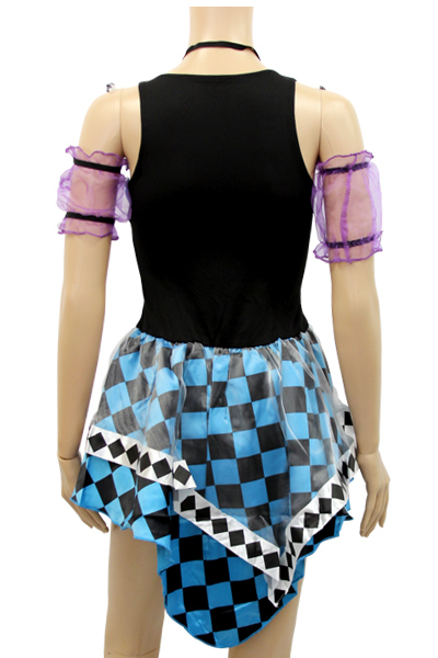ふしぎの国でティーパーティー♪カラフルポップなマッドハッター風のコスプレ衣装。ブルーをベースに紫×黒とハーリキンチェック柄を随所にちりばめたオシャレでポップなミニドレス。ハーリキンチェック柄で軽やかなスカートをお探しの方にもぴったり♪ドレスは柔らかな素材を使用したノースリーブのワンピースタイプ!後ろ丈が長いハイロウタイプのスカートは、シースルーのオーガンジー生地を重ねたレイヤードデザイン。さらに、マッドハッターの特徴でもある「10/6」ミニハットと首リボン、シースルーのアームバンドもセット!絶妙な色使いで魅せる女性版マッドハッター風のハロウィンコスチュームです。スカート部分にもハーリキンチェック柄で拘りたい方や、流行り廃りの無いシンプルなデザインで楽しめるかわいいタイプのチェック柄に目がない方にもお勧めです♪。※セット内容以外は付属しておりません。