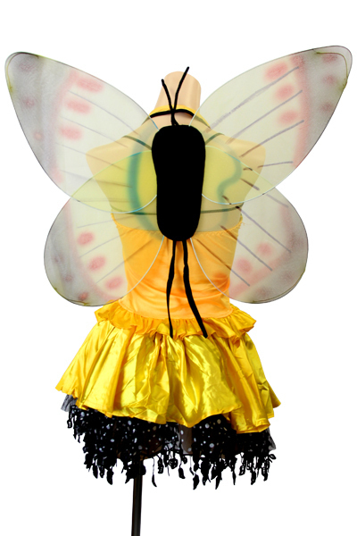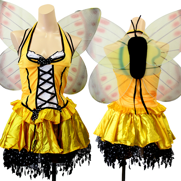 カラフルで大きな蝶々フォルムの羽付き♪セクシー&キュートなミツバチ風のコスプレ衣装。コルセット風の編み上げトップス&ボリューミーな光沢サテンのミニスカートがセットになった上下2ピースタイプ!柔らか素材のホルタートップスはビスチェのようにガーターストラップがついたセクシー仕様!スカート裾にはゆらゆらと揺れるシースルーの飾りをたっぷりON♪羽はゴム&※セット内容以外は付属しておりません。