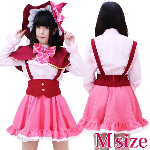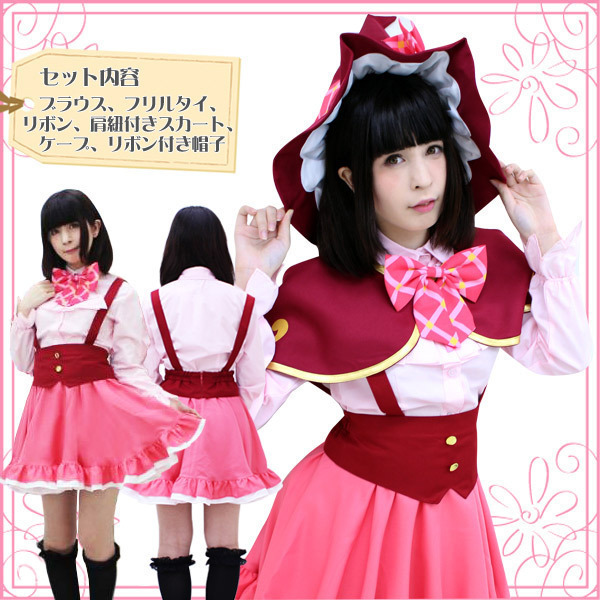 プリティでキュートな魔法つかいになりきり♪魔法学校の制服コスチュームセット。●花びら風の袖口が可愛いブラウス●パステルピンクのフリルタイ付き●裾フリルたっぷりの吊りスカート●ウエスト後ろゴム&ファスナー●金模様も忠実に再現したケープ●チェック柄リボン付きとんがり帽子●首元用のおそろい柄リボンもセット。帽子の内側にある模様までしっかりこだわって再現した豪華セットのなりきりコスチュームです。※水洗い不可、塩素系漂白剤による漂白不可、アイロンは中温で当て布使用、ドライクリーニング可、色落ちの可能性があります、ご注意ください。