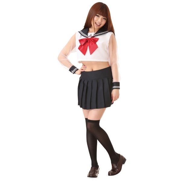 新発想!長袖シースルーが涼しげなセーラー服コスプレ。大きな赤いリボンがポイントのへそ出しブラウスと、ミニ丈プリーツスカートがとってもセクシー!誘惑度満点のコスチュームで刺激的なスクールコスプレをお楽しみ下さい!※靴下は付属しません