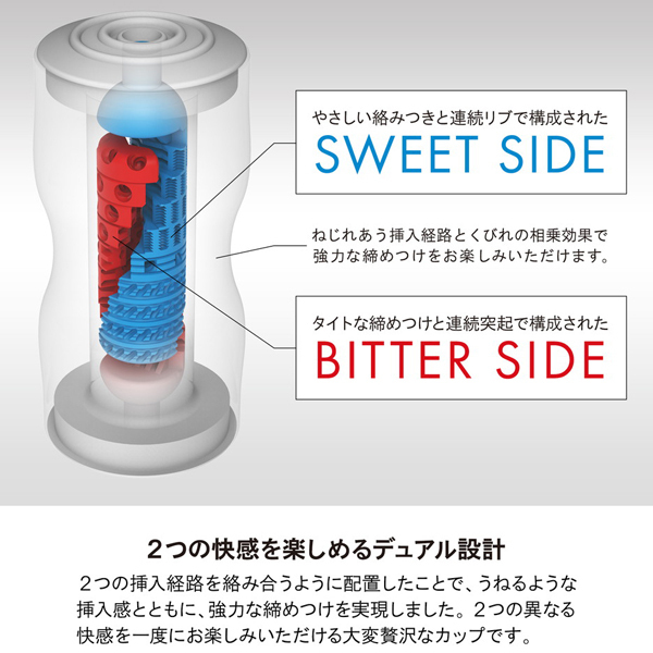 ワンランク上のテンガカップ、TENGA デュアルフィールカップが登場。プレミアムなダブルの快感がもたらす締めつけは、厳選された最高品質の素材と長年の実績の賜物!双方向から楽しめるプレミアムなWの快感。ハードな締め付けのビターサイドと優しく絡むスイートサイド。これら2つの異なる刺激が1つのカップで楽しめる♪最高品質の素材を採用したことでさらに洗練されたプレミアムなテンガの魅力。それぞれの快感をぜひお楽しみください!
