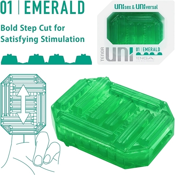 UNIsex&UNIversal。男性も女性も、ひとりでもふたりでも。性別やセクシャリティにとらわれず、誰でも楽しめる次世代プレジャーアイテム「TENGA UNI」。もっと気軽にもっと自由に、プレジャーライフを楽しもう!TENGA UNIは、ぷるぷるのストレッチ素材で作られているので、指にはめて女性器にあてたり、ひっくり返して男性器を包んだり自由な使い方で楽しめます。また、ひとりで楽しむだけでなくパートナーのために使うこともできるユニセックス&ユニバーサル設計のまったく新しいTENGAです。01 EMERALD [エメラルド]:大きなステップカットを越える刺激横向きに連なった大きなステップディテールによって、乗り越えるような刺激を楽しめます。