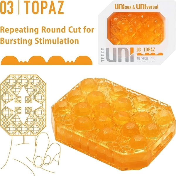 UNIsex&UNIversal。男性も女性も、ひとりでもふたりでも。性別やセクシャリティにとらわれず、誰でも楽しめる次世代プレジャーアイテム「TENGA UNI」。もっと気軽にもっと自由に、プレジャーライフを楽しもう!TENGA UNIは、ぷるぷるのストレッチ素材で作られているので、指にはめて女性器にあてたり、ひっくり返して男性器を包んだり自由な使い方で楽しめます。また、ひとりで楽しむだけでなくパートナーのために使うこともできるユニセックス&ユニバーサル設計のまったく新しいTENGAです。03 TOPAZ [トパーズ]:連なるラウンドカットの弾ける刺激全面に連なったラウンドディテールによって、転がり弾けるような刺激を楽しめます。