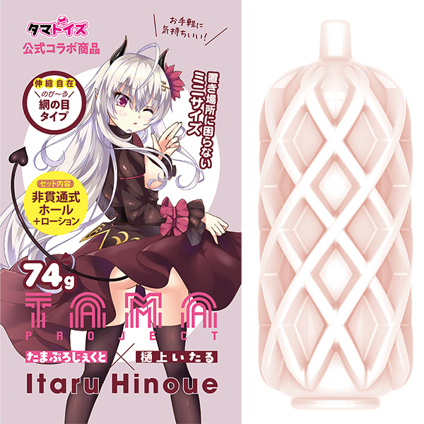 持ち運びにも便利なミニサイズの非貫通オナホです♪タマトイズの専属Vtuber「山田テュテュル」とのコラボ商品で、網の目状のヒダ構造が特徴!伸縮自在の柔らか素材で、気軽に使える設計です♪使い捨てタイプなので、お手入れも簡単!携帯性に優れ、ローションも付属しているので、開封後すぐに使えます♪全長74gの軽量設計で、置き場所にも困りません!イラストは樋上いたるが担当し、細部までこだわりが感じられます♪