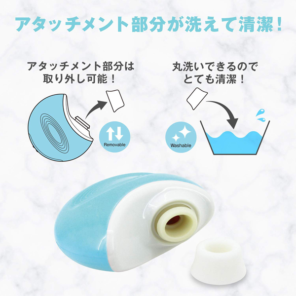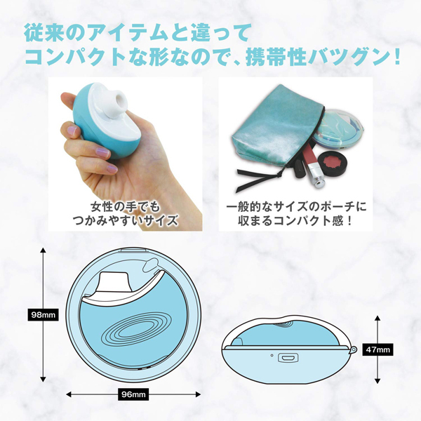 <ジューシーラムール・シークレットラブ>「吸って」「震える」CHU ROTORまるで美容家電!コンパクト型ケース付●Suction&Vibration・選べる吸引強弱と振動パターン・5段階吸引・6種振動●コンパクトケース付・水洗い可能・見つかってもばれにくい美容家電のようなパクト型ケース●Removable&Washable・見つかってもばれにくい美容家電のようなパクト型ケース・アタッチメント部分は取り外し可能・丸洗いできるためとても清潔●USBCharging・USB充電式●ケースに入れたまま充電可能、約110分の充電で約120分使用可能。ブルー