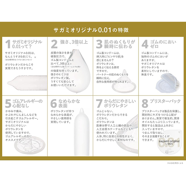 これまでよりもさらに薄く、柔らかく改良されたコンドーム、サガミオリジナル0.01Lサイズ。幸福の0.01ミリで使い心地は抜群♪まるで生でしているような感覚でゴムが苦手な方でも安心!薄くてつけていないかのような装着感をぜひ実感してください♪特別な日は001にしよう!ゴム臭もほとんど感じず、製品の品質も最高峰です。シリーズ史上最薄の0.01ミリで肌のぬくもりを瞬時にお伝えします♪