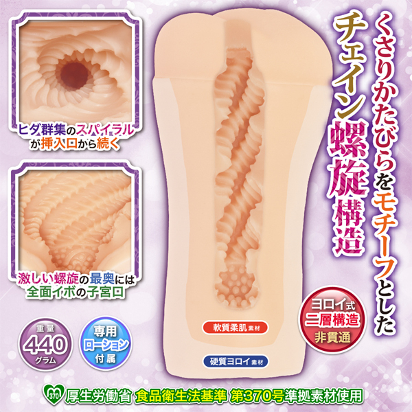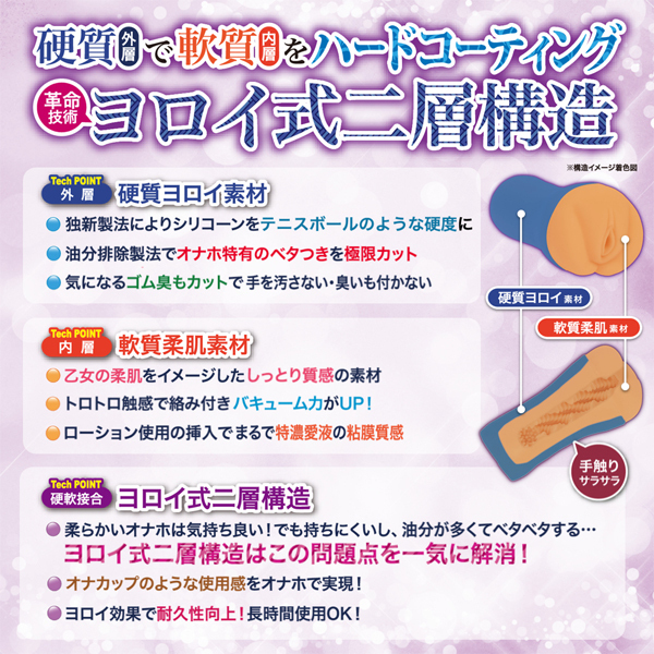 「柔らかいオナホは気持ちいい!でも持ちにくいし油分がベタベタする。」とお嘆きのあなたに、ヨロイ×乙女の柔肌!硬質素材(外層)で軟質素材(内層)をハードコーティング!見たまんまの分かりやすい構造と刺激特性。程よい弾力を備えたインナー素材のおかげで、表面に刻まれたヒダのジョリジョリも明瞭ですし、奥へと渦巻く内壁に吸い込まれる感覚に心地よさすら覚えます。このスパイラル状のヒダ加工は、ペニスにシッカリと絡み付きながら、カリなどの敏感ポイントも重点的に摩擦。ゾゾッとタテ方向になぞるような誘導も発生し、それらすべての快感が複合して襲ってくるのも特長です。さらに強バキュームによる密着感は、こうしたハイレベルな快感の土台としても影響しており、「巴御前」と並んで単純刺激の強い、射精力に秀でたモデルに位置づけられます。簡単お手軽なオナカップの使用感で、非貫通オナホのバキューム力を得られるオナホールです。