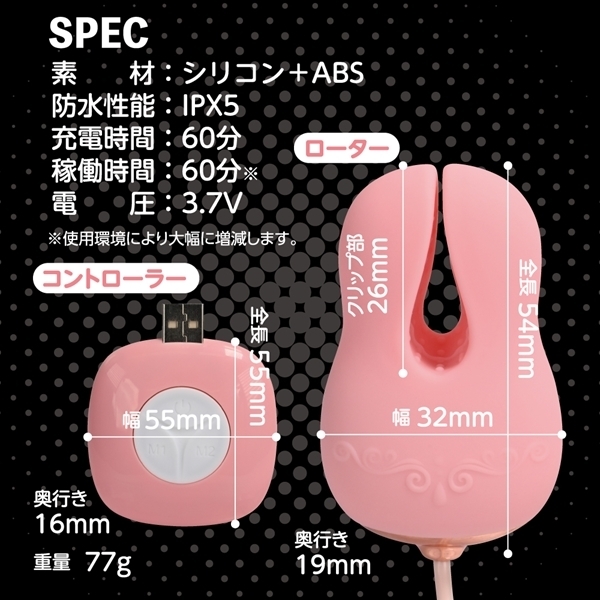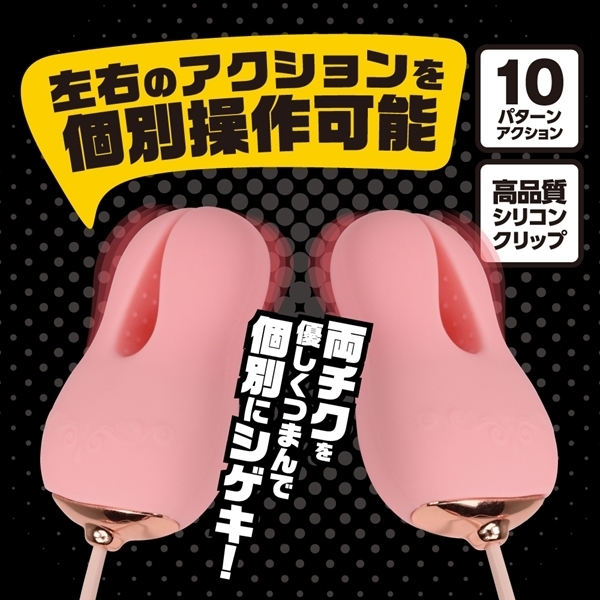 左右それぞれ独立したアクションが楽しめる乳首ローター♪左右で異なる感じ方に合わせ、振動の強さやパターンを個別に調整可能です!クリップ部分には肌触りにこだわった高品質シリコンを採用し、優しくしっかりと摘む感覚が心地よいです♪コントローラーは直感的に操作しやすい3ボタン式で、好みの10パターンから振動を選べます!IPX5の高レベル防水性能で、しっかり洗えて衛生面も安心♪60分の充電で最大60分連続使用が可能です!