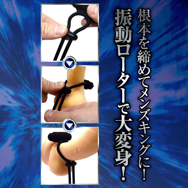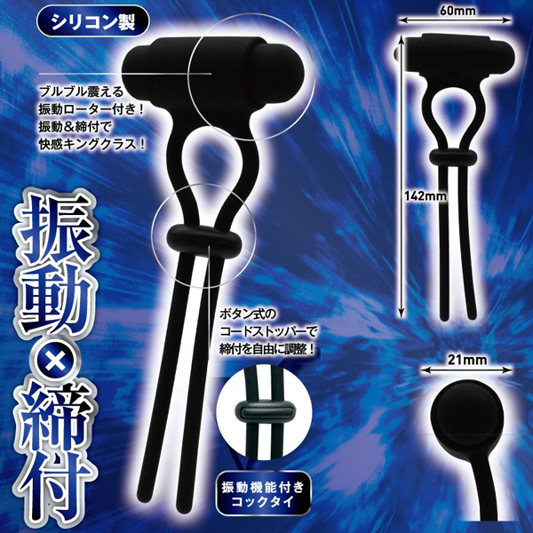 根本を締めてメンズキングに!快感キングクラスのコックタイ、「締王」!根本に巻きつけて、ネクタイのようキュッと締めれば、まるで王者のような貫禄に大変身!締め付け部分のコードストッパーは、自由に調整できるボタン式!本体素材は、肌触りがよいシリコン製!締め付ければ、もう貴男はまさにメンズキング!タイプ「V」は、「VIBRATION」の「V」!ブルブル震えるローターが組み込まれた、振動機能付きのコックタイです。自分もパートナーも振動快感を楽しめます!締め付け&振動ローターで、ダブル快感に大変身!