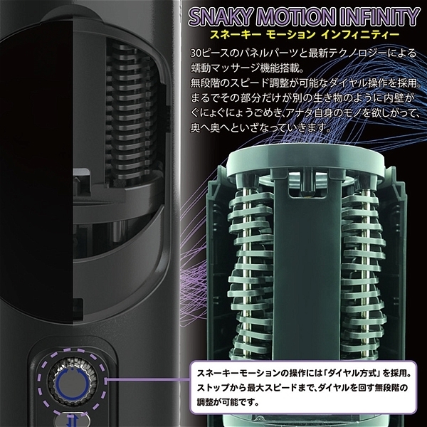 新時代は、この「電動オナホール」だ。うごめく「ひと肌の温もり」の中で「強力ピストン」。無段階蠕動モーションによる「無限大∞(インフィニティ)」プレイ。ムカデの足のような「30枚のパネル」が、インナーホールに絡みついてうごめきます。それは、まるで鍛え上げたアスリート女性の「ミミズ千匹」を超える刺激。さらに、ホットヒーターパネルで「人間の体内の温度」を再現。うごめく、あったかい膣孔が「強力モーターで激しくピストン」。<特徴>・わかりやすい簡単操作の「コントロールパネル」・ピストンパターンは選べる「10種類」・ピストンスピードはローからスーパーハイまで「10種類」・うごめくスネーキーモーションはダイヤル操作で「無段階」のスピード調整が可能・インナーホールを温めるホットヒーターパネルで「ひと肌温度」再現・強力なピストンと繊細な作動を可能にする「内蔵パワフルモーター」・最大300分の動作が可能な「大容量バッテリー搭載」・お手軽な「USB充電」